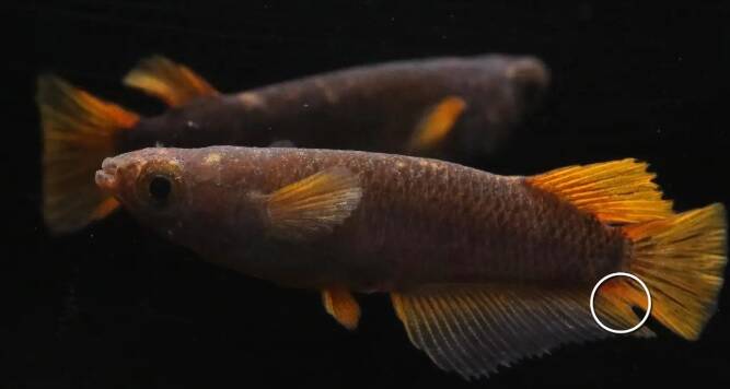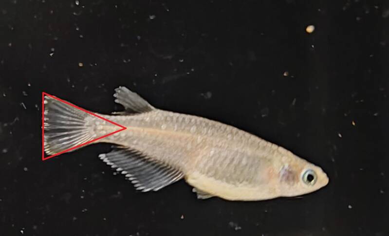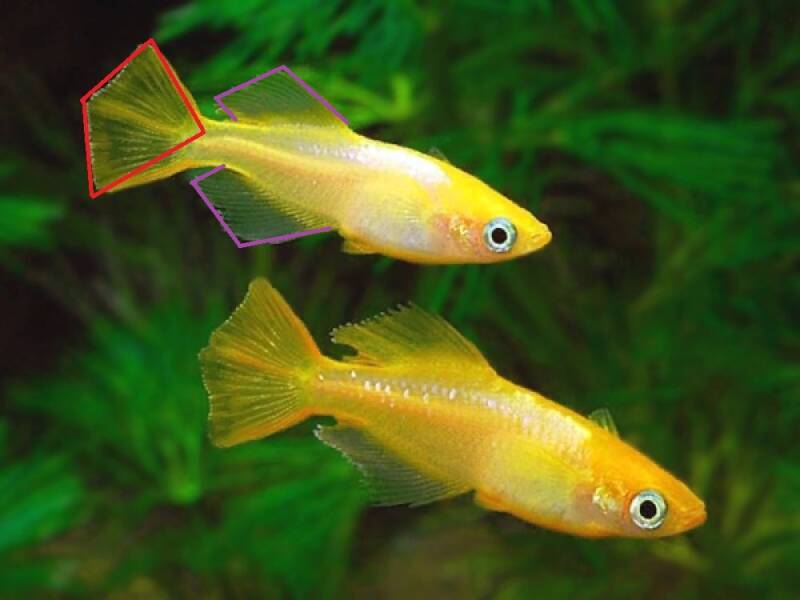 - Vinnen hebben gekartelde randen maar geen verlengde vinstralen. Langere rug-, aars- en staartvin kan wel voorkomen.